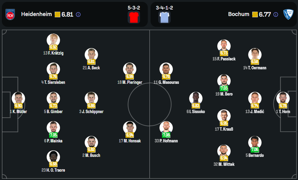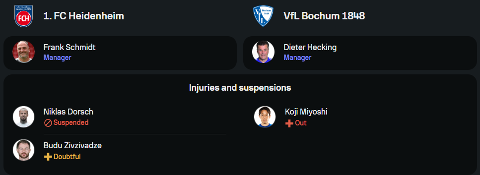 ไฮเดนไฮม์ ภายใต้การคุมทีมของ แฟรงค์ ชมิดท์ พึ่งปลดล็อกคว้าชัยในลีกได้จากการบุกเชือดสตุ๊ตการ์ต 1-0 หลังไม่ชนะใครมา 4 นัดติด อย่างไรก็ตามเกมนี้พวกเขาจะหมดสิทธิ์ใช้งาน นิคลาส ดอร์ช ห้องเครื่องตัวหลักที่ติดโทษแบน ทำให้ต้องขยับ อาเดรียน เบ็ค กลับมาแพ็คแดนกลางร่วมกับ ยาน ช็อปป์เนอร์ ส่วนแนวรุกจะได้ มาธิอัส ฮอนซัค ที่เพิ่งฟิตกลับมายิงประตูชัยในนัดล่าสุดลงล่าตาข่ายร่วมกับ มาร์วิน เพียริงเกอร์ ในระบบ 3-5-2 ที่เน้นเกมริมเส้นและการจบคมเฉียบ