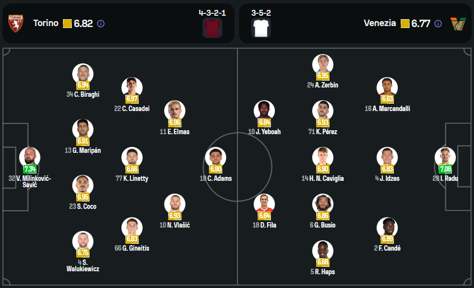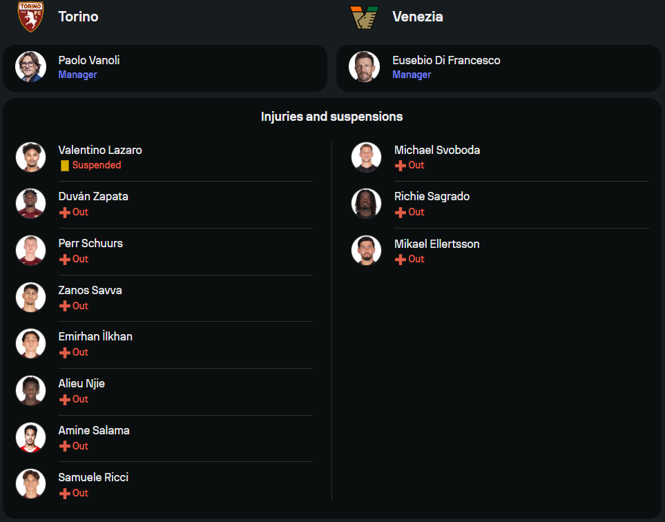 ฝั่ง เวเนเซีย ของ ยูเซบิโอ ดิ ฟรานเชสโก้ ก็ไม่น้อยหน้าเรื่องตัวเจ็บ โดยขาดทั้ง ไมเคิล สโวโบด้า, ริชี ซากราโด้ และ มิคาเอล เอเลิร์ตสัน ที่ยังเดี้ยงอยู่ แต่แกนหลักยังอยู่กันครบ โดยเกมนี้จะใช้ระบบ 3-5-2 เพื่อแพ็กเกมกลางให้แน่น วาง กีเก้ เปเรซ, ฮันส์ คาบิเกลีย และ จานลูก้า บูซิโอ คุมจังหวะเกมรุก-รับ ส่วนสองหัวหอกฝากความหวังไว้ที่ จอห์น เยบัวห์ และ คริสเตียน กิตเคียร์ ที่ยังต้องเร่งความคมให้ไวก่อนที่จะสายเกินไป