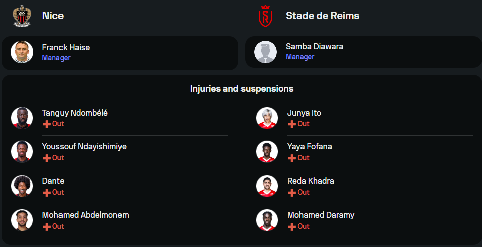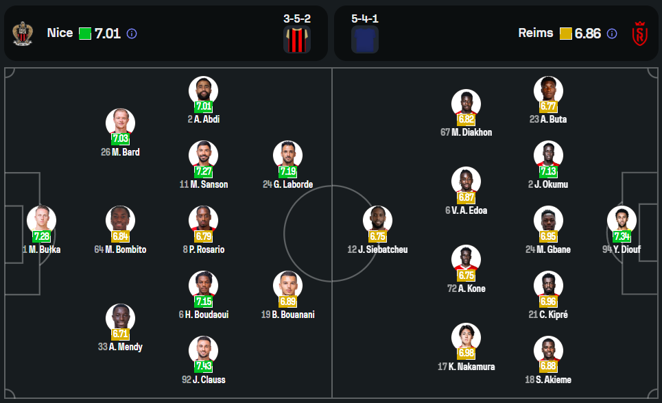 นีซ ของกุนซือ ฟร็องค์ ไอส์ ยังคงขาดผู้เล่นหลายรายเช่น แทนกี เอ็นดอมเบเล่, โมฮาเหม็ด อับเดลโมเน็ม, ดันเต้, และ ยุสซูฟ เอ็นดายี่ชิมิเย่ ที่ยังอยู่ในลิสต์บาดเจ็บ แต่ข่าวดีคือได้ มัวเซ่ บอมบิโต้ กลับมาประจำการแนวรับอีกครั้ง พร้อมนำทีมลุยในระบบ 3-4-3 โดยมีสามประสานแนวรุกคือ บาเดรดีน บูวานี่, แกต็อง ลาบอร์ และ เฌเรมี่ โบก้า หรืออาจจะเป็น เอวาน เกสซานด์ ที่พร้อมลงมาซัดแบบฟูลสปีดเช่นกัน