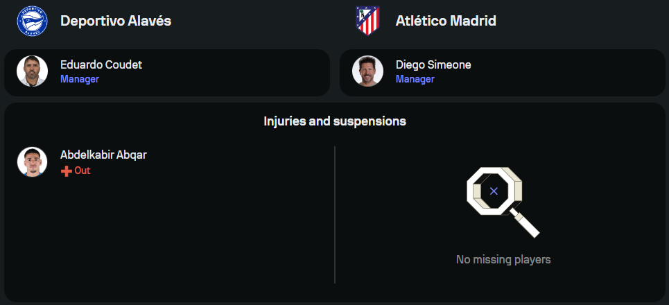 อลาเบส ของ เอดูอาร์โด้ โคูเด็ต สถานการณ์ยังคงน่าเป็นห่วงแม้ล่าสุดจะเปิดบ้านสอยโซเซียดาดไปได้ 1-0 ก็ตาม แต่สภาพทีมยังไม่สมบูรณ์เต็มร้อย เพราะจะไม่มี อับเดล อับคาร์ แนวรับตัวเก่งที่ยังเจ็บยาว ส่วนข่าวดีคือ มานู ซานเชซ และ ซานติ มูริโญ่ พ้นโทษแบนกลับมาพร้อมลุย แผนการเล่นยังคงยึด 4-2-3-1 โดยมี กิเก้ การ์เซีย ยืนค้ำหอก และมี คาร์ลอส บิเซนเต้ กับ คาร์เลส อาเลนญ่า คอยเติมเกมริมเส้น