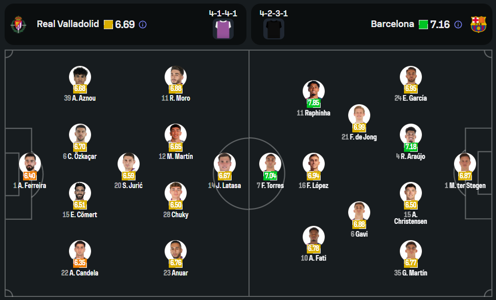 บาร์เซโลน่า แม้จะเพิ่งเสมอ 2 นัดติดในเกมถ้วยยุโรปและโกปา เดล เรย์ แต่ผลงานในลีกยังคงร้อนแรง โดย 4 เกมลีกหลังสุดไม่แพ้ใครและคว้าชัยถึง 3 นัด แถมฟอร์มนอกบ้านไม่ธรรมดา ชนะรวดมาแล้ว 4 เกมติดต่อกัน ยิงรวมไปถึง 11 ประตู กำลังหลักหลายคนฟอร์มดีต่อเนื่อง โดยเฉพาะ ราฟินญ่า ที่กดเรต 7.85 เป็นคนปั่นป่วนริมเส้นฝั่งขวาให้คู่แข่งทุกเกม