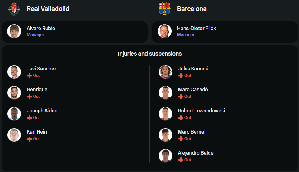ทางฝั่ง บาร์เซโลน่า ของกุนซือ ฮานส์-ดีเตอร์ ฟลิค มีข่าวร้ายคือการขาด โรเบิร์ต เลวานดอฟสกี้ และผู้เล่นอีกหลายคนที่ยังอยู่ในลิสต์เดี้ยง เช่น ฌูลส์ คุนเด้, มาร์ก คาซาโด้ และ มาร์ก เบอร์นัล อย่างไรก็ตามกำลังหลักอย่าง เฟร์ราน ตอร์เรส, ราฟินญ่า, เดอ ยอง และ กาบี ยังพร้อมประจำการ เกมนี้มาในระบบถนัด 4-2-3-1 พร้อมปั้นเกมริมเส้นแบบจัดเต็มด้วยการใช้ ยามาล และ ราฟินญ่า เป็นตัวจี๊ดขนาบข้าง