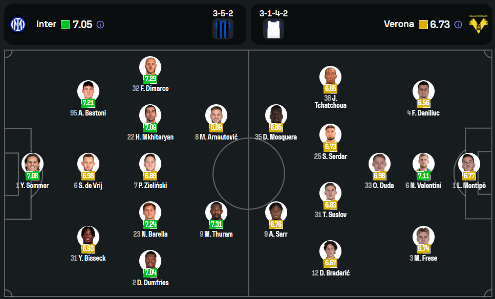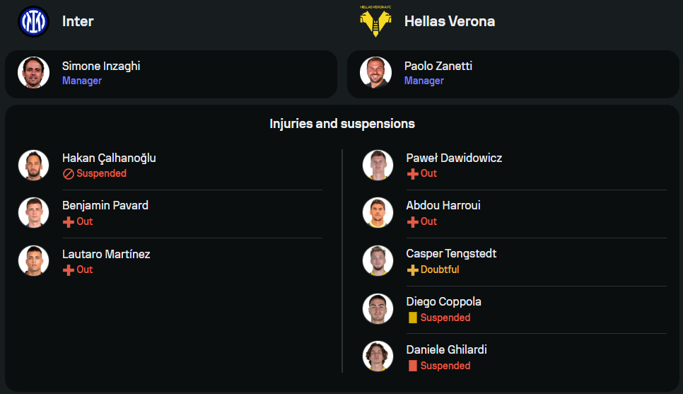 อินเตอร์ มิลาน ของกุนซือ ซิโมเน่ อินซากี้ มีปัญหาเรื่องตัวผู้เล่นอยู่ไม่น้อย เกมนี้จะหมดสิทธิ์ใช้งาน ฮาคาน ชัลฮาโนลู ที่ติดโทษแบน รวมถึง เบนฌาแม็ง ปาวาร์ และ เลาตาโร่ มาร์ติเนซ ที่ยังเจ็บยาว แต่ข่าวดีคือแข้งกำลังหลักอย่าง นิโคโล่ บาเรลล่า, มาร์คุส ตูราม และ เฟเดริโก้ ดิมาร์โก้ ยังฟิตสมบูรณ์พร้อมลงสนาม ระบบที่คาดคือ 3-5-2 โดยมี อาร์เนาโตวิช จับคู่กับ กอร์เรอา ในแดนหน้า