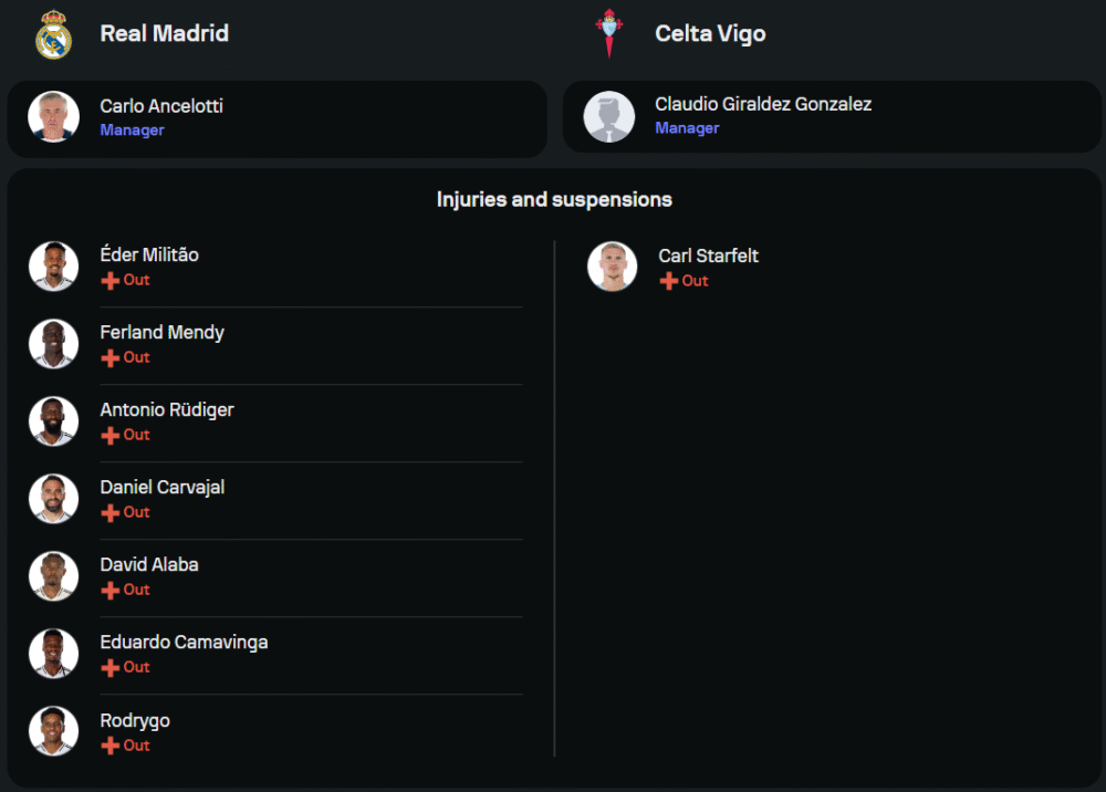 คาร์โล อันเชล็อตติ เจอปัญหาใหญ่ในเกมนี้เมื่อแข้งหลักพาเหรดกันบาดเจ็บและติดโทษแบนหลายราย โดยเฉพาะแนวรับอย่าง อันโตนิโอ รูดิเกอร์, แฟร์กล็อง เมนดี้, ดานี่ การ์บาฆาล, เอแดร์ มิลิเตา และ ดาบิด อลาบา ทั้งหมดลงไม่ได้แน่นอน ส่วน จู๊ด เบลลิ่งแฮม กับ คามาวิงก้า ยังต้องรอเช็คอาการ เช่นเดียวกับ คีลิยัน เอ็มบัปเป้ ที่ยังไม่ฟิตเต็มร้อย เกมนี้อาจต้องให้ วินิซิอุส จูเนียร์ ยืนหน้าเป้า พร้อมสนับสนุนจาก ดานี่ เซบาญอส, เบลลิ่งแฮม และ โรดรีโก้ ด้านผู้รักษาประตูยังไว้ใจ ติโบ กูร์กตัวส์ ยืนเฝ้าเสา