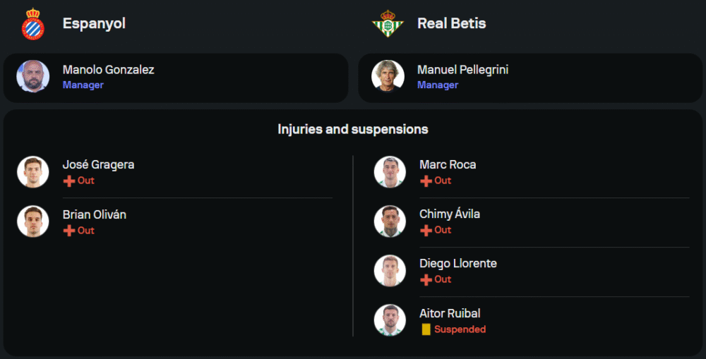 ฝั่ง เรอัล เบติส ภายใต้การคุมทีมของ มานูเอล เปเยกรินี่ เกมนี้มีปัญหาบางจุดเมื่อ ดีเอโก้ ยอเรนเต้, มาร์ก โรก้า และ ชิมี่ อาบิล่า ไม่พร้อมลงสนาม ส่วน อาอิตอร์ รุยบัล โดนโทษแบน เกมนี้คาดว่าจะมีการโรเตชั่นบ้างบางตำแหน่ง โดย อาเดรียน จะได้ลงเฝ้าเสา แบ็กสองข้างจะใช้ ซาบาลี่ และ โรดริเกซ ในขณะที่แนวรุกจะวาง อีสโก้, อันโตนี่ และ เอซซัลซูลี่ ลุยแหลก