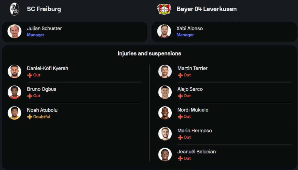 แม้จะเพิ่งกระเด็นตกรอบแชมเปี้ยนส์ลีกกลางสัปดาห์ แต่ทีมของ ชาบี อลอนโซ่ ยังคงแข็งแกร่งด้วยขุมกำลังหลักแน่นปึ้ก เกมนี้ไม่มีหน้าใหม่บาดเจ็บเพิ่มเติมจากชุดหลัก มีเพียงตัวเดี้ยงเดิมๆ 5 ราย ซึ่งไม่ได้กระทบแผนการจัดทีมมากนัก พวกเขาน่าจะยึดแกนหลักเดิมลงสนามนำโดย ปาทริค ชิค, ฟลอเรียน เวียร์ตซ์ และ กรานิต ชาก้า ที่จะคุมเกมแดนกลางเหมือนเดิม