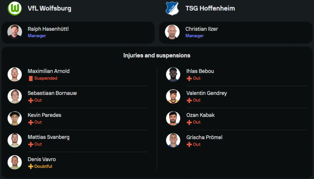 หลังผลงานดิ่งลงเหวชนิดหยุดไม่อยู่ โวล์ฟสบวร์กถึงขั้นเปลี่ยนแป้นกุนซือกลางฤดูกาล ปลด ราล์ฟ ฮาเซ่นฮุตเทิ่ล ออกจากตำแหน่ง พร้อมดัน แดเนี่ยล เบาเออร์ จากทีมเยาวชนขึ้นมาคุมชุดใหญ่แบบกะทันหัน สถานการณ์ภายในทีมยังไม่นิ่ง แต่พวกเขาก็หวังพึ่งความสดจากแข้งอย่าง โมฮัมเหม็ด อามูร่า และ โยนาส วินด์ ที่กลับมาเป็นตัวจริงในแนวรุก แถมยังมีมิดฟิลด์สายวิ่งอย่าง อัสเตอร์ ฟรังค์ คอยตัดเกมแดนกลาง ด้าน มักซิมิเลี่ยน อาร์โนลด์ ยังติดโทษแบน และตัวเจ็บอีกเพียบ โดยเฉพาะแนวรับที่ขาดทั้ง บอร์โนว์ และ สวานเบิร์ก