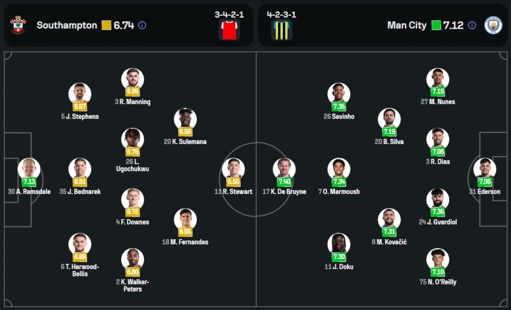 ฝั่งทีมเยือน แมนฯซิตี้ ภายใต้บังเหียนของ เป๊ป กวาร์ดิโอล่า ฟอร์มกำลังโหดสุดขีด เกมรุกคล่อง เกมรับแน่น ตัวหลักอยู่กันครบยกเว้นแค่ โรดรี, สโตนส์ และอาเก้ ที่เจ็บต่อเนื่อง แนวรุกนำโดย เควิน เดอ บรอยน์ เพลย์เมกเกอร์จอมแอสซิสต์ที่พร้อมปล่อยบอลให้พวก เฌเรมี่ โดกู, มาร์มูช และฮาลันด์ ปิดสกอร์ แนวรับมีกวาร์ดิโอลจับคู่ดิอาส ส่วนเอแดร์ซอนยืนเฝ้าเสาในระบบ 4-2-3-1 ที่เต็มไปด้วยพลังทะลวงแนวรับคู่แข่ง