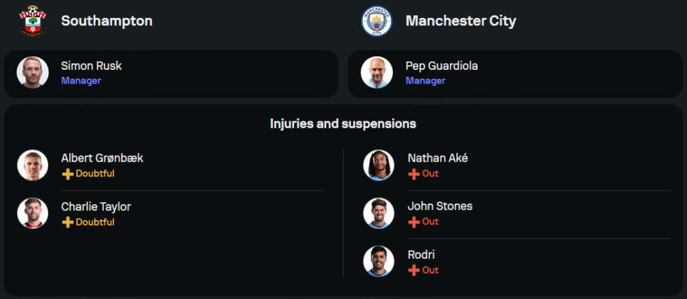 เริ่มจากเจ้าบ้าน เซาแธมป์ตัน ที่คุมทัพโดยกุนซือขัดตาทัพอย่าง ไซม่อน รุสค์ ผลงานย่ำแย่จนต้องลุ้นหนักกับการอยู่รอดในลีกสูงสุด สภาพทีมแม้ไม่มีตัวเจ็บเพิ่ม แต่ผู้เล่นที่มีอยู่ก็ใช่ว่าจะทดแทนกันได้อย่างกลมกล่อม โดยเกมนี้จะมาในแผน 3-4-2-1 โดยมี ปอล โอนูอาชู หอกตัวสูงใหญ่เป็นหน้าเป้า มีคามัลดีน ซูเลมาน่า และมาเตอุส แฟร์นานเดส สนับสนุนจากแถวสอง แนวรับใช้ เบดนาเร็ก, ฮาร์วู้ด-เบลลิส และสตีเฟ่นส์ ช่วยกันสกัดคลื่นลูกโตของผู้มาเยือน