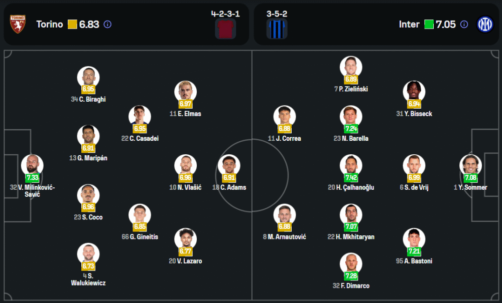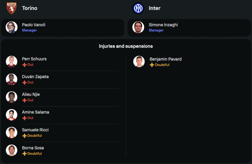 โตริโน่ภายใต้การคุมทัพของ เปาโล วาโนลี่ แม้ฟอร์มโดยรวมช่วงหลังจะดรอปลง แต่ยังคงรักษาความเหนียวแน่นยามเล่นในรังเอาไว้ได้ดี สภาพทีมถือว่าพอรับได้แม้จะมีตัวเจ็บบาน ไม่ว่าจะเป็น แพร์ ชูร์ส, ดูวาน ซาปาต้า และเอมีน ซาลาม่า ที่หมดสิทธิ์ช่วยทีม ขณะเดียวกัน วาเลนติโน่ ลาซาโร่ พ้นโทษแบนกลับมาประจำการได้ ส่วนกองกลางอย่าง ซามูเอเล่ ริชชี่ ยังต้องรอเช็คฟิตอีกที คาดว่าเกมนี้จะยึดแผน 4-3-2-1 ใช้ เช อดัมส์ เป็นหน้าเป้าคอยทะลวงตาข่าย ขนาบข้างด้วยตัวรุกความเร็วสูงอย่าง วลาชิช และลาซาโร่ เป็นตัวสนับสนุน