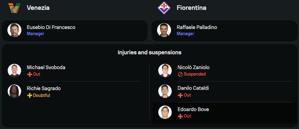เวเนเซีย ภายใต้การนำของ ยูเซบิโอ ดิ ฟรานเชสโก้ ยังต้องดิ้นรนอย่างหนักเพื่อความอยู่รอดในลีกสูงสุด ความหวังยังไม่หมดแม้ผลงานจะลุ่มๆ ดอนๆ โดยเฉพาะในบ้านที่ชนะเพียง 1 จาก 5 เกมหลังสุด ข่าวดีคือพวกเขาได้ผู้รักษาประตูมือหนึ่งอย่าง ฟิลิป สแตนโควิช กลับมาฟิตสมบูรณ์อีกครั้ง แต่คาดว่าจะยังให้ อังเดรย์ ราดู ลงเฝ้าเสาต่อไป ตัวเจ็บยังคงเป็นหน้าเดิมๆ อย่าง ไมเคิล สโวโบด้า และ ริชี ซากราโด้ แนวรุกคาดว่าจะใช้ เยบัวห์ จับคู่กับ กิตเคียร์ โดยมีแผงกลาง 5 คนปั้นเกมอย่างเข้มข้น พร้อมใช้แผน 3-5-2 เดินเกมสู้สุดกำลัง