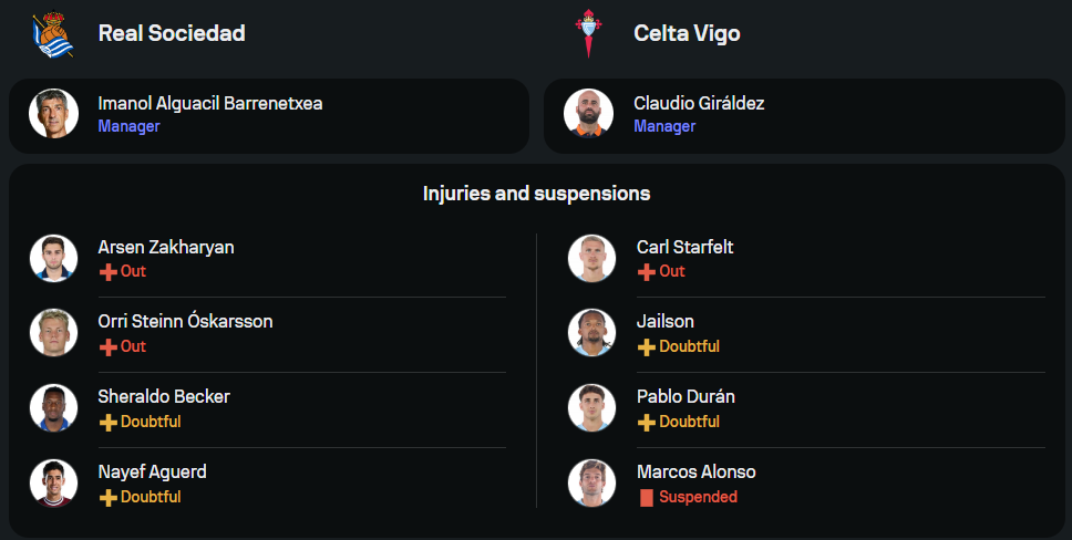 ทีมของกุนซือ อีมานอล อัลกวาซิล เจอปัญหาผู้เล่นบาดเจ็บอย่างต่อเนื่อง โดยล่าสุดจะไม่มีชื่อของ อาร์เซน ซาคาร์ยาน, ออร์รี่ ออสการ์สสัน และ เชรัลโด้ เบ็คเกอร์ ที่เดี้ยงยาว ขณะที่ นาเยฟ อาเกิร์ด ยังต้องรอเช็กสภาพความฟิต แต่ยังดีที่แนวรุกมีทีเด็ดอย่าง มิเกล โอยาร์ซาบัล, ทาเคฟุสะ คุโบะ และ ลูก้า ซูชิช ที่พร้อมปั่นป่วนแนวรับทีมเยือน ระบบจะมาในแผน 4-1-4-1 วาง ซูบิเมนดี้ คุมกลาง และปล่อยให้แนวรุกเคลื่อนที่อิสระเพื่อจบสกอร์