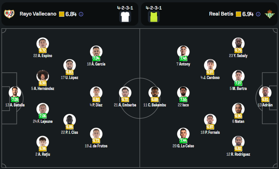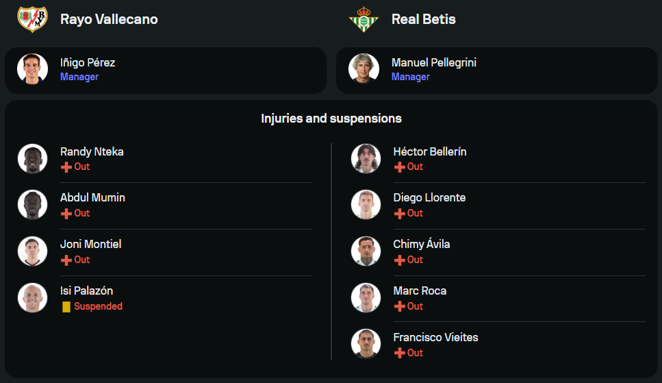 ฝั่งเจ้าถิ่น ราโย่ บาเยกาโน่ ของกุนซือ อีญิโก้ เปเรซ เกมนี้จะขาดตัวหลักอย่าง อิซัค ปาลาซอน ที่ติดโทษแบน รวมถึง 3 แข้งเดี้ยงทั้ง แรนดี้ เอ็นเตก้า, อับดุล มูมิน และ โจนี มอนเตียล การจัดทัพยังคงใช้ระบบ 4-2-3-1 วางแนวรุกอย่าง ออสการ์ เทรโฆ่ และ อัลบาโร่ การ์เซีย เป็นทีเด็ดประจำการกลางสนาม ขณะที่กองหน้าจะฝากความหวังไว้กับ แรนดี้ เอ็นเตก้า ที่มีความเร็วและการจบสกอร์เฉียบคม