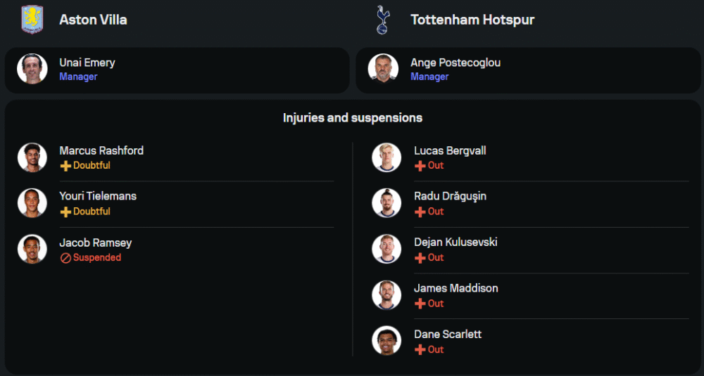 ลูกทีมของ อูไน เอเมรี่ ยังคงเดินหน้าอย่างแข็งแกร่งแม้จะมีปัญหาตัวผู้เล่น โดยเกมนี้หมดสิทธิ์ใช้งาน จาค็อบ แรมซี่ย์ ที่ติดโทษแบน ขณะที่ มาร์คัส แรชฟอร์ด และ ยูริ ตีเลอม็องส์ ยังต้องเช็กความฟิต อย่างไรก็ตาม วิลล่าก็ยังมีแกนหลักอย่าง โอลลี่ วัตกิ้นส์, มาร์โก อาเซนซิโอ้, และ เอมิเลียโน่ มาร์ติเนซ ที่ฟอร์มกำลังเข้าฝัก รักษาสมดุลในเกมรุกและรับได้ดี ตลอดจนม้านั่งสำรองที่พร้อมลงมาทำผลงานได้เสมอ
