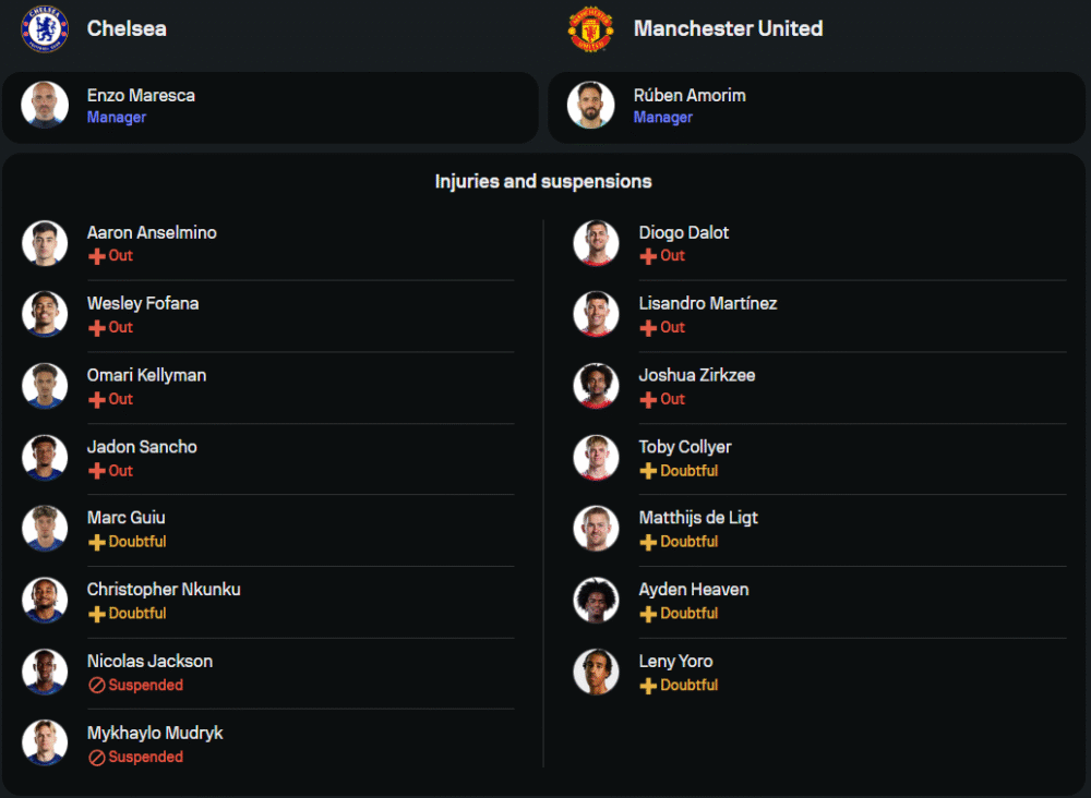 สถานการณ์ “ปีศาจแดง” ภายใต้การนำของ รูเบน อาโมริม ถือว่าไม่สดใสเท่าไร ขาดผู้เล่นตัวหลักไปหลายรายเช่น ลิซานโดร มาร์ติเนซ, ดิโอโก้ ดาโลต์ และ โจชัว เซิร์คซี ยังไม่หายเจ็บ ส่วนดาวรุ่งอย่าง โตเบียส คอลล์เยอร์, มัตไธย์ส เด ลิกต์, อายเดน เฮเว่น และ เลนี่ โยโร่ ก็อยู่ในข่ายต้องเช็กฟิต แต่แข้งหลักยังอยู่กันครบทั้ง บรูโน่ แฟร์นานเดส, คาเซมิโร่, แฮร์รี่ แม็กไกวร์ และ ราสมุส ฮอยลุนด์ ซึ่งพร้อมเป็นความหวังในระบบ 3-4-2-1 เน้นรับรอสวนกลับและหวังเซอร์ไพรส์ในเกมนี้