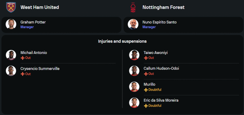 ฟาก “เจ้าป่า” ของ นูโน่ เอสปิริโต้ ซานโต สภาพทีมไม่ต่างจากเวสต์แฮมมากนัก ปัญหาหลักคือแข้งตัวรุกอย่าง ไตโว่ อาโวนิยี่ และ คัลลัม ฮัดสัน-โอดอย ยังเดี้ยงยาว รวมถึง อีริก ดา ซิลวา โมไรร่า ที่หมดสิทธิ์ช่วยทีมในโค้งสุดท้าย อย่างไรก็ตาม กำลังสำคัญยังอยู่กันครบ โดยเฉพาะแนวรับที่มี นิโกล่า มิเลนโควิช กับ โมราโต้ คุมแผงหลัง แดนกลางใช้บริการ อิบราฮิม ซ็องกาเร่ กับ เอลเลียต แอนเดอร์สัน แนวรุกฝากความหวังไว้ที่ มอร์แกน กิ๊บบ์ส-ไวท์ และ คริส วู้ด ในระบบ 4-2-3-1