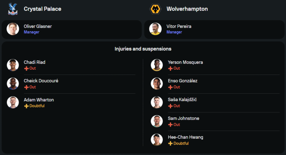 ฝั่งทีมเยือนยังคงขาดขุมกำลังหลักหลายราย ไม่ว่าจะเป็น ซาซ่า คาลายด์ซิช, เอ็นโซ่ กอนซาเลซ, เยร์สัน มอสเกอร่า, ซามูเอล จอห์นสโตน รวมถึง เลออน ชิโวม ที่ต้องพักรักษาตัวต่อเนื่อง อย่างไรก็ตาม โครงสร้างหลักของทีมยังครบถ้วน นำโดย โชเซ่ ซา เฝ้าเสา กองหลังวาง แม็ตธิว โดเฮอร์ตี้, เอ็มมานูเอล อั๊กบาดู และ โตติ โกเมส กลางสนามใช้ เชา โกเมส จับคู่ อันเดร ตรินดาเด้ ขนาบข้างด้วยวิงแบ็ค เนลสัน เซเมโด้ และ รายาน ไอต์-นูรี่ ส่วนแนวรุกให้ มาร์แชลล์ มูเน็ตซี่ กับ มาเธอุส คุนญ่า ขับเคลื่อนเกมสนับสนุนหัวหอก กอนซาโล่ กูเอเดส