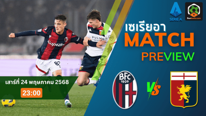 เมื่อฤดูกาลใกล้จะปิดฉาก ความมันส์ในลีกสูงสุดอิตาลีอย่าง เซเรียอา ก็ยิ่งระอุขึ้นทุกขณะ! คืนวันเสาร์ที่ 24 พฤษภาคม 2568 นี้ เวลา 23:00 น. ตามเวลาประเทศไทย เหล่าแฟนบอลเตรียมตัวมันส์หยดกับศึกที่สนามของ โบโลญญ่า ซึ่งจะเปิดบ้านต้อนรับการมาเยือนของ เจนัว ที่ต่างฝ่ายต่างไม่มีอะไรต้องลุ้นอีกแล้ว นอกจากศักดิ์ศรีและความสะใจของแฟนบอลในเกมส่งท้ายฤดูกาลนี้!