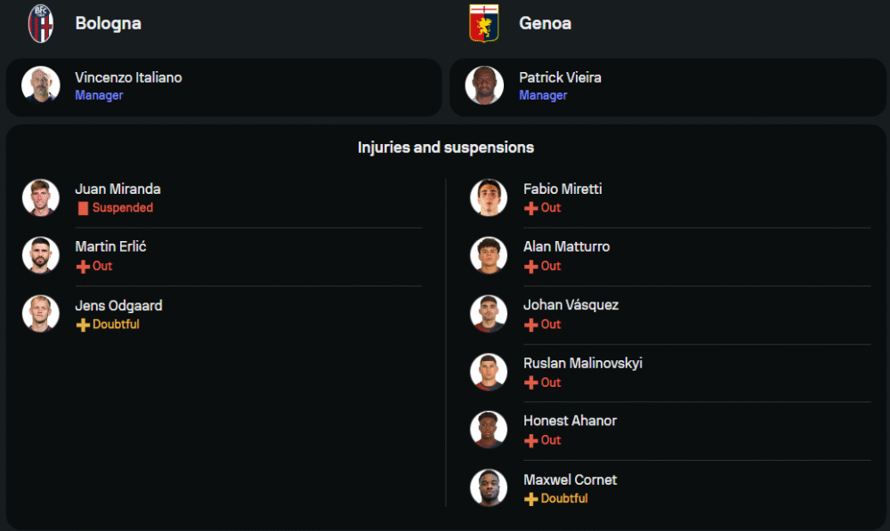 ทางฝั่ง เจนัว ปัญหาใหญ่ยังคงเป็นแนวรับที่เสียประตูง่ายขึ้นเรื่อยๆจากสถิติ 5 นัดหลังสุดเสียถึง 10 ประตู ขณะที่เกมรุกต้องฝากความหวังไว้กับ ปินามอนติ และการขึ้นเกมจากปีก เทียบฟอร์มโดยรวมและ วิเคราะห์บอล จากศักยภาพทีม เห็นได้ชัดว่าโบโลญญ่าเหนือกว่าทุกมิติ ทั้งเกมรุก, เกมรับ, สภาพจิตใจและความแข็งแกร่งในบ้าน ราคาต่อ “หนึ่งลูก” อาจดูสูงแต่หากพิจารณาจากฟอร์มและสถานการณ์ในตอนนี้ มองว่าเจ้าถิ่นมีโอกาสยิงขาดได้