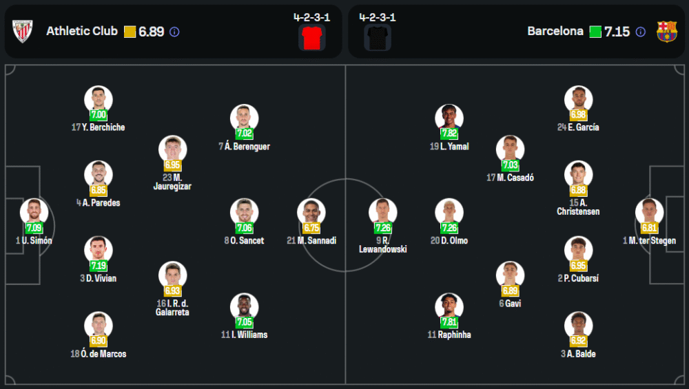 ฝั่งทีมเยือน “เจ้าบุญทุ่ม” ของกุนซือ ฮันส์-ดีเตอร์ ฟลิค อาจไม่ฟูลทีมเท่าไหร่ นักเตะตัวหลักอย่าง โรนัลด์ อาเราโฆ่, ฌูลส์ คุนเด้, มาร์ก เบอร์นัล, เฟร์ราน ตอร์เรส และ ดานี่ โรดริเกซ เจ็บยาวหมดสิทธิ์ลงช่วยทีม แต่แผงเกมรุกยังจัดเต็ม มี โรเบิร์ต เลวานดอฟสกี้ เป็นหน้าเป้า ขนาบด้วยสองสปีดสเตอร์ ราฟินญ่า กับ ลามีน ยามาล ที่กำลังฟอร์มแรง ระบบ 4-2-3-1 ของบาร์ซ่าเน้นบุกและคุมจังหวะเหมือนเดิม