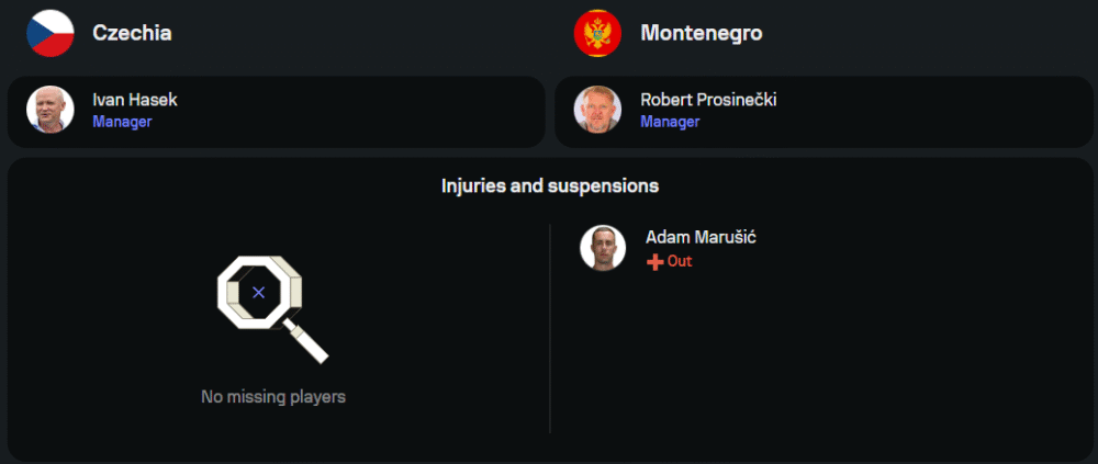 ผลงานของมอนเตเนโกรช่วงหลังก็จัดว่ามั่นคง ชนะ 3 จาก 5 นัดล่าสุดในทุกรายการ นอกจากเกมรับที่เหนียวแน่น เกมรุกยังอาศัยทีเด็ดจากตัวเก๋าและตัวความเร็วสูงในแดนหน้า แต่ต้องยอมรับว่าคุณภาพคู่แข่งที่ผ่านมายังเทียบกับเช็กไม่ได้