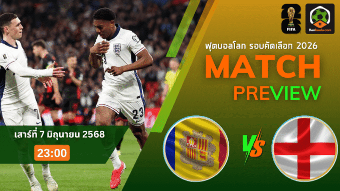 ศึกฟุตบอลโลกรอบคัดเลือก โซนยุโรป กลุ่ม K คืนนี้ “อันดอร์ร่า” เตรียมเปิดรังรับการมาเยือนของ “อังกฤษ” ทีมเต็งจ่าฝูงที่เครื่องแรงตั้งแต่ต้นรอบนี้ ความมันส์กำลังจะระเบิดลงในสนาม คืนวันที่ 7 มิถุนายน 2568 เวลา 23:00 น. ตามโปรแกรม ตารางบอลวันนี้ ใครที่รอวางบิลหรือเชียร์ทีมขวัญใจ ห้ามพลาดเด็ดขาด!
