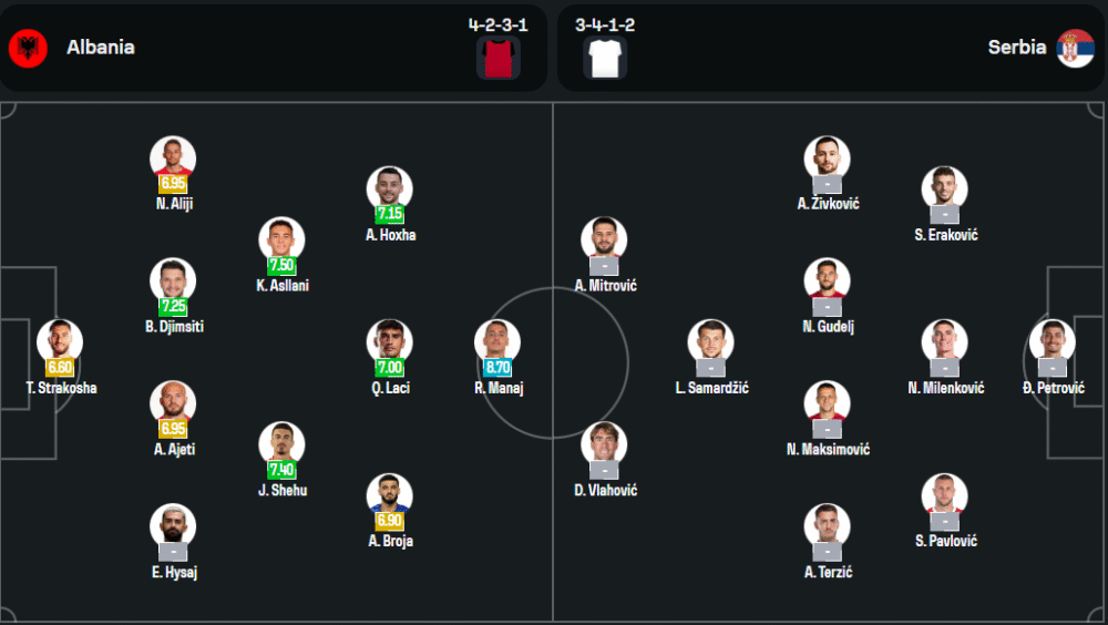 แอลเบเนีย ภายใต้การคุมทัพของ ซิลวินโญ่ ยังคงขาดแค่ ไคดี้ บาเร่ มิดฟิลด์สายขยันที่เจ็บไปก่อนหน้านี้ แต่ขุมกำลังหลักยังอยู่กันครบ เรย์ มานาย ตัวล่าสกอร์ประจำชาติ เมียร์โต อูซูนี่, อาร์มันโด้ โบรย่า กองหน้าจากพรีเมียร์ลีก, เยลแบร์ รามาดานี่ กลางเชิงสูง, เนดิม บายรามี่, คริสเตียน อัสญานี่, เอลเซอิด ไฮซาย แบ็กขวา และ เบร๊าต ฌิมซิตี้ ยืนหลังแน่นเหมือนเดิม โธมัส สตราโคช่า นายด่านมือหนึ่งของทีมพร้อมลงเฝ้าเสา เกมนี้แฟนบอลเจ้าถิ่นมั่นใจเรื่องความฮึกเหิม