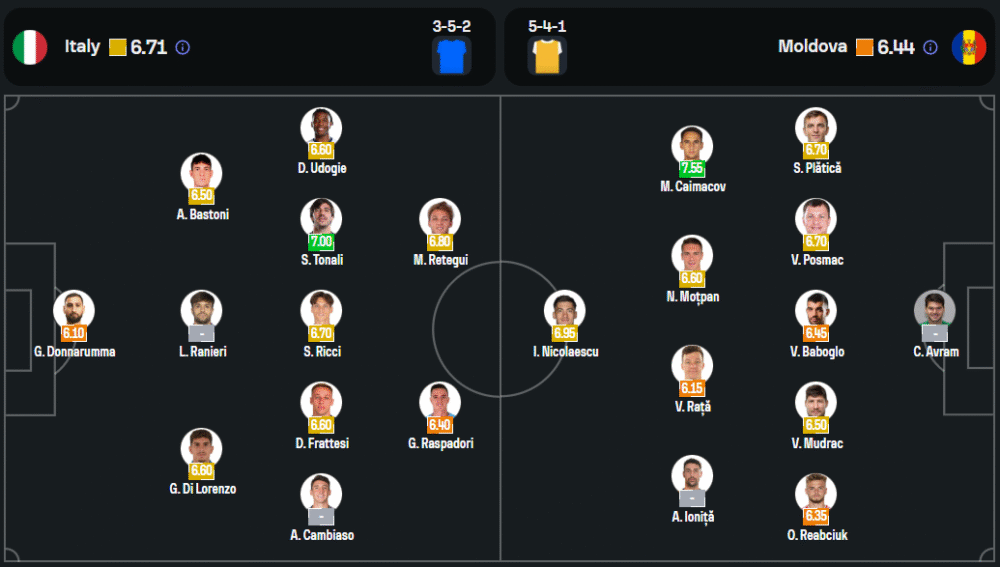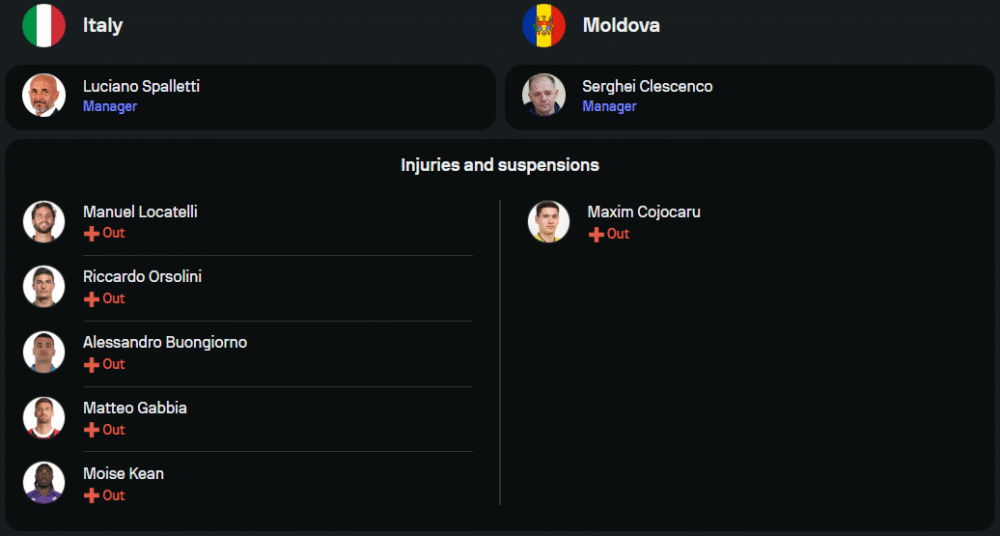 ลูกทีมของ ลูชาโน่ สปัลเล็ตติ เปิดตัวด้วยความพังพินาศหลังบุกไปโดน นอร์เวย์ กระซวกเละ 0-3 เรียกได้ว่าความมั่นใจตกฮวบทันที แถมปัญหานักเตะบาดเจ็บก็ยังรุมเร้า ไม่ว่าจะเป็น มานูเอล โลคาเตลลี่, ริคคาร์โด้ ออร์โซลินี่, อเลสซานโดร บูโอนจอร์โน่, มัตเตโอ กับเบีย และ มอยเซ่ คีน ที่ต่างเจ็บยาวหมดสิทธิ์ลงช่วยทีม คาดว่ารูปแบบ 3-5-2 จะยังคงถูกใช้ พร้อมส่ง ซานโดร โตนาลี่, ดาวิเด้ ฟรัตเตซี่ และ ซามูเอเล่ ริชชี่ คุมแดนกลาง ส่วนคู่หน้าเป็นหน้าที่ของ จาโคโม รัสปาโดรี่ กับ มาเตโอ เรเตกี
