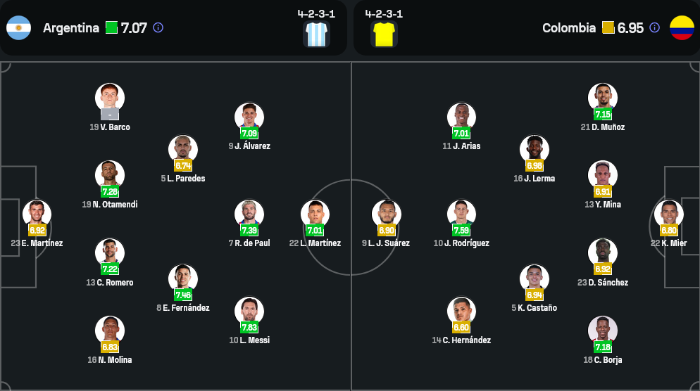 ตรงกันข้ามกับฟ้าขาว โคลอมเบียของ เนสตอร์ ลอเรนโซ่ ยังไม่ชนะใครเลยใน 5 นัดหลังสุด เกมรุกฝืดแถมแนวรับรั่วยับ วันนี้มีข่าวดีเล็ก ๆ เมื่อ หลุยส์ ดิอาซ ตัวรุกจากลิเวอร์พูลพ้นโทษแบนกลับมาเพิ่มมิติในเกมรุก แต่ก็ยังมีเครื่องหมายคำถามเกี่ยวกับฟอร์มของ หลุยส์ ซัวเรซ ที่น่าจะได้ออกสตาร์ทแทน ยอห์น ดูราน แนวรับวาง เยร์รี่ มิน่า และ ดาวินซอน ซานเชซ ที่แม้จะมีประสบการณ์แต่ยังมีจังหวะพลาดให้เห็นบ่อย ๆ เกมนี้ต้องรับมือกับแนวรุกสุดจี๊ดของอาร์เจนติน่าแบบเต็มกำลัง