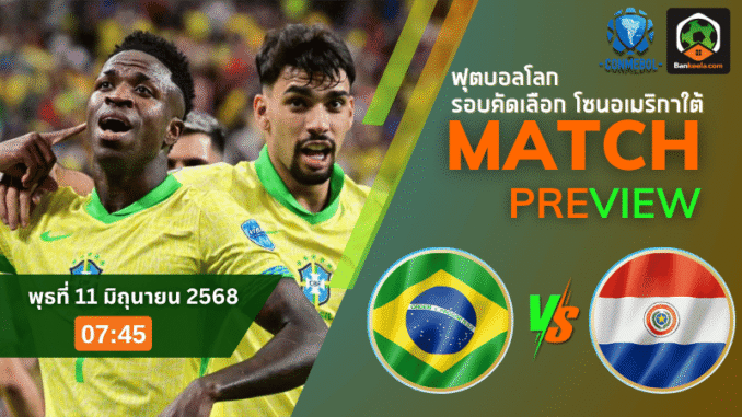 แมตช์เดือดปลุกความมันตั้งแต่เช้ามืดในศึก ฟุตบอลโลก 2026 รอบคัดเลือก โซนอเมริกาใต้ วันพุธที่ 11 มิถุนายน 2568 เวลา 07:45 น. ขุนพล ทีมชาติบราซิล ที่ยังไม่กลับสู่ร่างเทพ ต้องเปิดบ้านรับการมาเยือนของ ทีมชาติปารากวัย ที่ผลงานดีสวนทางแบบคนละโลก นี่คืออีกหนึ่งคู่เอกของเช้าวันนี้ที่ขึ้นตรงอันดับความมันใน ตารางบอลวันนี้ แบบไม่มีข้อกังขา เพราะมีทั้งความกดดัน ความแค้น และแรงลุ้นตั๋วเต็มพิกัด!