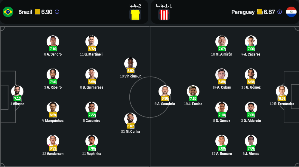 บราซิล (4-3-3) : อลิสซอน – วานแดร์ซอน, มาร์ควินญอส, ลูคัส เบรัลโด้, อเล็กซ์ ซานโดร – บรูโน่ กิมาไรส์, คาเซมิโร่, เกอร์ซอน – อันโตนี่, มาเธอุส คุนญ่า, วินิซิอุส จูเนียร์