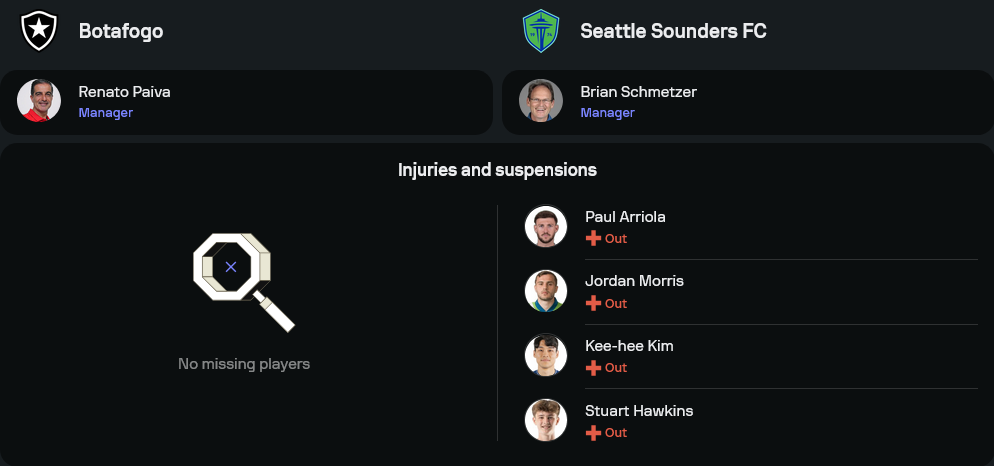 นี่คือการโคจรมาดวลกันครั้งแรกในเวทีระดับโลกของสองสโมสรจากต่างซีกโลก โบตาโฟโก้ ตัวแทนแกร่งจากบราซิล จะต้องวัดคมกับ ซีแอตเทิล ซาวน์เดอร์ส ตัวแทนจากเมเจอร์ลีกสหรัฐฯ แม้จะไม่มีข้อมูลการพบกันในอดีต แต่หากวิเคราะห์ตามสไตล์บอลและผลงานที่ผ่านมาแล้ว ชี้ได้เลยว่านี่คือแมตช์ที่มี ทีเด็ดบอล ให้ลุ้นกันทุกนาทีแน่นอน
