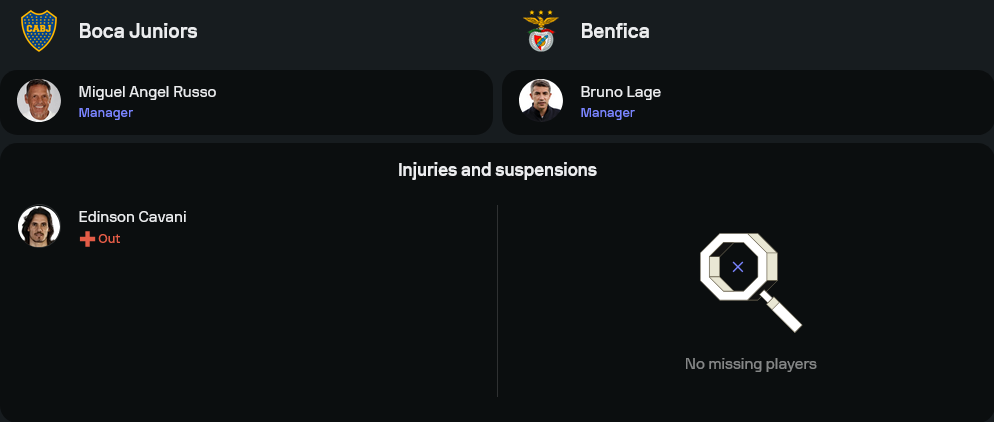 โบคา จูเนียร์ส เจอปัญหาใหญ่เมื่อ เอดิสัน คาวานี่ หอกจอมเก๋าหมดสิทธิ์ลงสนามจากอาการบาดเจ็บ ส่งผลให้ มิเกล เมเรนเทียล ต้องรับหน้าที่ไล่ล่าตาข่ายแทน ขณะที่แนวรุกจะได้ เอ็กเซกิเอล เซบาญอส, แฟร้งค์ ปลาซิออส และ เควิน เซน่อน สนับสนุนจากแดนสอง ด้านแนวรับนำโดย มาร์กอส โรโฆ่ อดีตแข้งแมนฯ ยูไนเต็ด ที่ต้องรับบทเป็นหัวใจในเกมรับของทีม