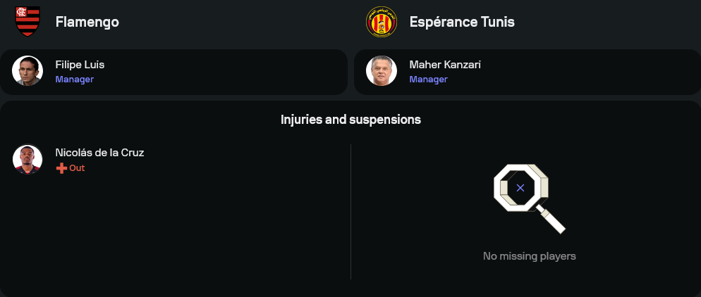 ฟลาเมงโก้ ภายใต้การคุมทีมของ ฟิลิเป้ หลุยส์ ยอดแบ็กซ้ายในตำนานของบราซิลที่ผันตัวมาเป็นกุนซือ ได้เรียกขุมกำลังหลักมาพร้อมหน้า ยกเว้น นิโคลัส เด ลา ครูซ ที่มีอาการบาดเจ็บ ขุมกำลังหลักจะนำโดย จอร์เจียน เด อาร์รัสกาเอต้า, แกร์ซอน, และ ลุยซ์ อเราโจ้ โดยมี อากุสติน รอสซี่ เฝ้าเสา และ อเล็กซ์ ซานโดร ยืนแนวรับฝั่งซ้าย พร้อมจัดระบบ 4-2-3-1 เดินเกมรุกเต็มสูบ