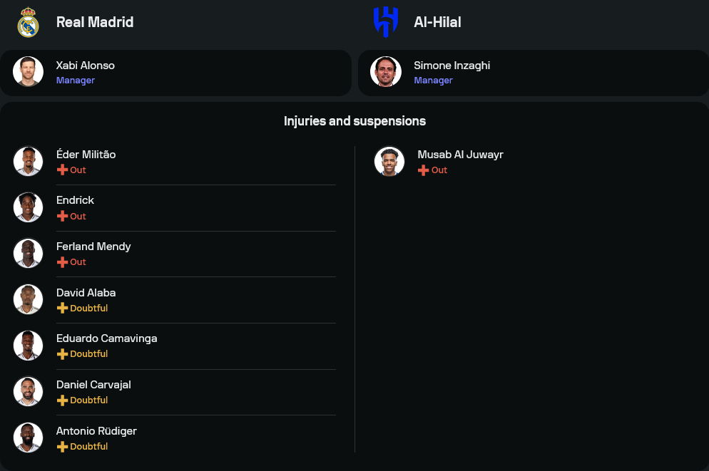 ฝั่ง เรอัล มาดริด ภายใต้การคุมทีมของ ชาบี อลอนโซ่ ที่เพิ่งเข้ารับตำแหน่งได้ไม่นานต้องเจอบททดสอบแรกอย่างหนัก เพราะมีนักเตะบาดเจ็บเพียบ ไล่ตั้งแต่ เอแดร์ มิลิเตา, แฟร์กล็องด์ เมนดี้, เอ็นดริก และยังมีแข้งที่ยังไม่ฟิตสมบูรณ์อย่าง ดาวิด อลาบา, เอดูอาร์โด้ คามาวิงก้า, ดาเนียล การ์บาฆาล และ อันโตนิโอ รูดิเกอร์ อย่างไรก็ตาม กำลังหลักอย่าง วินิซิอุส จูเนียร์, คิเลียน เอ็มบัปเป้, จู๊ด เบลลิงแฮม และ เฟเดริโก้ บัลเบร์เด้ ยังพร้อมลุยเต็มพิกัด คาดว่าจะมาในแผน 4-3-3 โดยมี ลูนิน เฝ้าเสา ขณะที่แนวรุกจัดเต็มสามประสานสุดโหด
