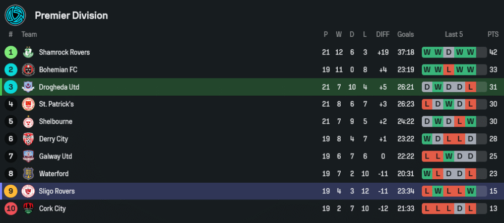 5 นัดหลังสุดในลีก พวกเขาชนะเพียงนัดเดียวเท่านั้น โดยเสมอไปถึง 3 และแพ้ 1 เกมล่าสุดก็แพ้ให้จ่าฝูง แชมร็อค โรเวอร์ส คาบ้าน 1-2 แบบน่าผิดหวัง ฟอร์มในบ้าน 10 นัดหลังแม้จะแพ้เพียง 2 เกม แต่ก็เสมอถึง 4 นัด แสดงให้เห็นว่าเกมรุกยังขาดความเด็ดขาด ส่วนแนวรับเริ่มมีรอยรั่วให้เห็นมากขึ้น