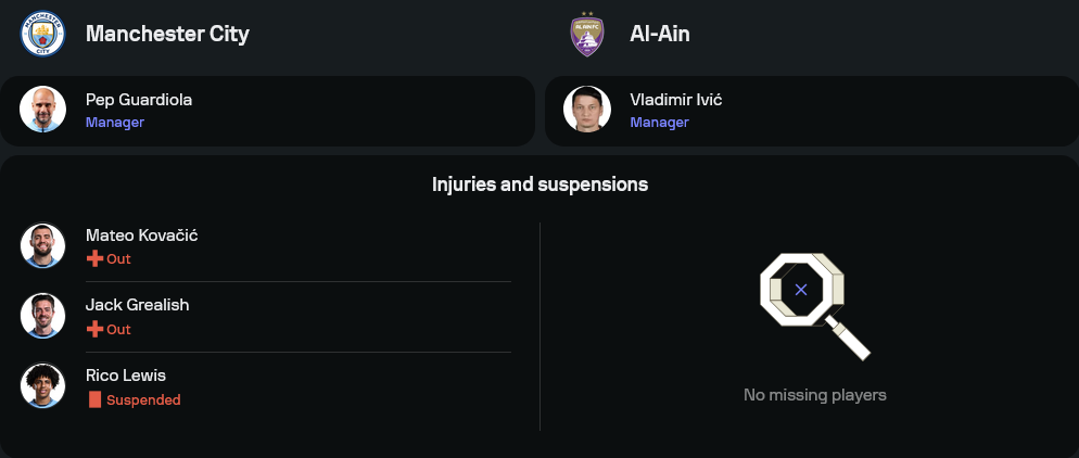 แมนฯซิตี้ ของ เป๊ป กวาร์ดิโอล่า กำลังอยู่ในช่วงล่าแต้มเพื่อการันตีเข้ารอบ หลังประเดิมสนามด้วยชัยชนะเหนือ วีดาด คาซาบลังก้า 2-0 สภาพทีมล่าสุดมีปัญหาเล็กน้อยเมื่อ ริโก้ ลูอิส แบ็กดาวรุ่งติดโทษแบนจากใบแดงเกมก่อน ขณะที่ มาเตโอ โควาซิช ยังเดี้ยงต่อเนื่อง ด้าน แจ็ค กรีลิช แม้ไม่มีชื่อในรายงานก็ยังไม่พร้อมใช้งาน เกมนี้คาดว่า เป๊ป จะมาในระบบ 4-2-3-1 โดยวาง เออร์ลิ่ง ฮาลันด์ ยืนหอกเป้า โดยมีสามตัวรุกสุดจี๊ด ฟิล โฟเด้น, เฌเรมี่ โดกู และ ซาวินโญ่ คอยทำเกมด้านหลัง