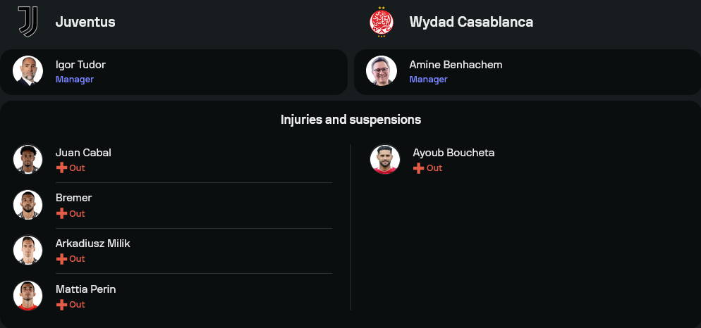 ยูเวนตุส ภายใต้การคุมทัพของ อีกอร์ ทูดอร์ กำลังอยู่ในช่วงพีค ฟอร์มโหดชนิดคู่แข่งต้องขนลุก โดยเฉพาะแมตช์ล่าสุดที่ไล่ยิง อัล ไอน์ ถึง 5-0 สะท้อนถึงระบบการเล่นที่ลงตัว สภาพทีมก่อนเกมนี้แม้ยังไม่มี ฮวน กาบัล, เบรเมร์, มัตเตีย เปริน และ อาร์คาดิอุสซ์ มิลิค แต่ข่าวดีคือ โลคาเตลลี่ ฟิตพร้อมกลับมายืนกลางบัญชาเกม โดยจะยืนร่วมกับ เคเฟรน ตูราม และ แม็คเคนนี่ ส่วนเกมรุกวาง คอนไซเซา และ ยิลดิซ ทำเกมให้กับ โคโล มูอานี่ หัวหอกที่พร้อมซัดประตูทุกวินาที