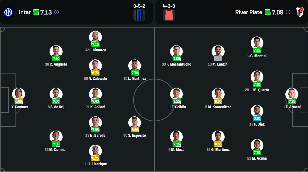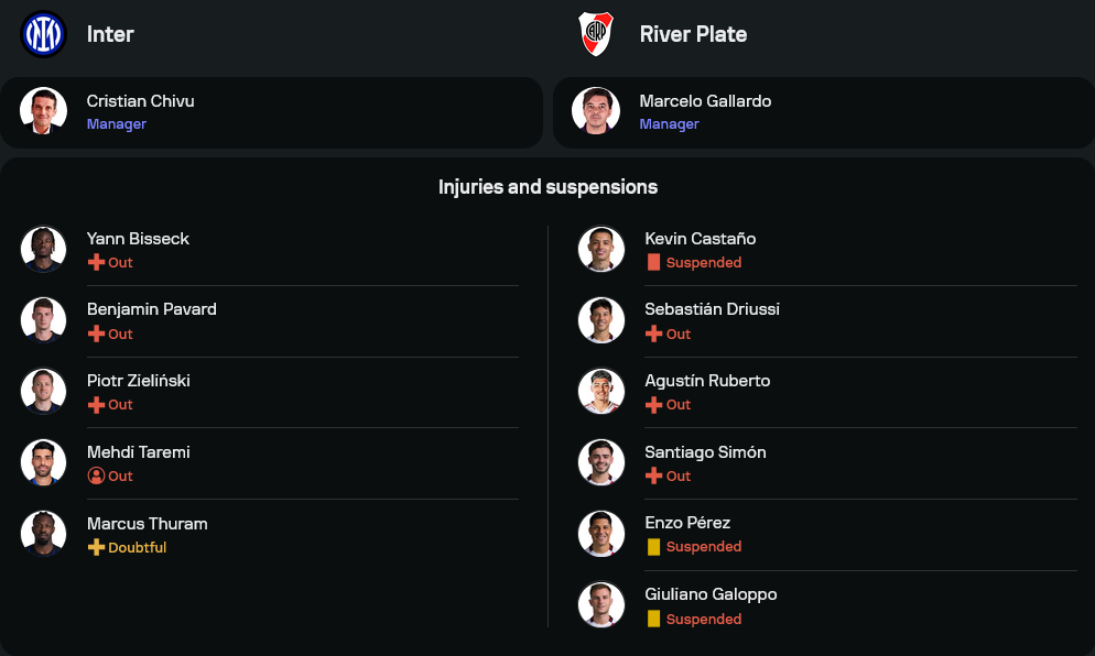 ทางฝั่ง ริเวอร์เพลท ของเทรนเนอร์ มาร์เซโล่ กายาร์โด้ เจอสถานการณ์ไม่ง่ายในเรื่องขุมกำลัง เพราะมีผู้เล่นโดนโทษแบนถึง 3 รายคือ เควิน คาสตาโญ่, เอ็นโซ เปเรซ และ จูเลียโน่ กาล็อปโป้ แถมตัวหลักหลายรายก็อยู่ในช่วงโรเตชั่น อย่างไรก็ตามแกนหลักอย่าง เปาโล ดิอาซ, ลูกัส มาร์ติเนซ กัวร์ตา, ฟรังโก โคลิดิโอ, มักซิเมียโน่ เมซ่า ยังพร้อมลุยเต็มสูบ โดยน่าจะมาในระบบ 4-3-3 อาศัยความเร็วและการเคลื่อนที่เข้าทำแบบอเมริกาใต้หวังเจาะแนวรับอินเตอร์ให้ได้ตั้งแต่ต้นเกม