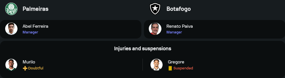 ฝั่ง พัลไมรัส ภายใต้การบัญชาการของกุนซือมากฝีมือ อาเบล เฟร์ไรร่า สภาพทีมถือว่าพร้อมพอสมควร โดยมีเพียง มูริโล่ ที่ส่อแววจะพลาดลงสนามเนื่องจากอาการบาดเจ็บ แกนหลักชุดเดิมยังอยู่ครบ นำโดย เวแวร์ตอน เฝ้าเสา แผงหลังมี ฟุคส์ กับ กุสตาโว่ โกเมซ ขันเกมรับ ส่วนตัวรุกสามประสานจัดเต็ม เอสเตวาโอ, เวก้า, และ ตอร์เรส คอยป้อนบอลให้ วินิซิอุส โรเก้ ล่าตาข่าย