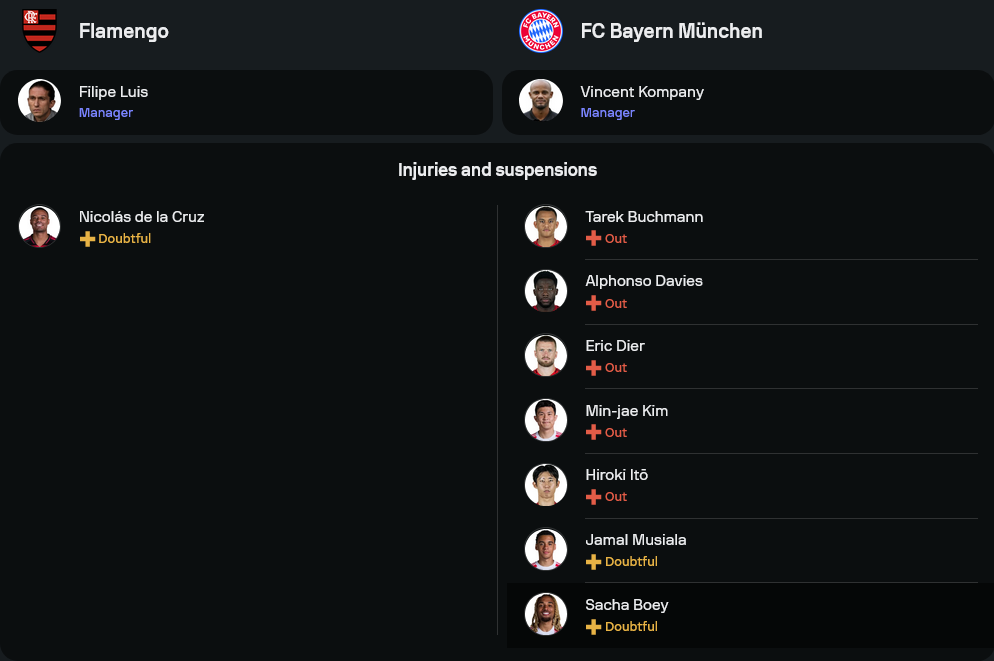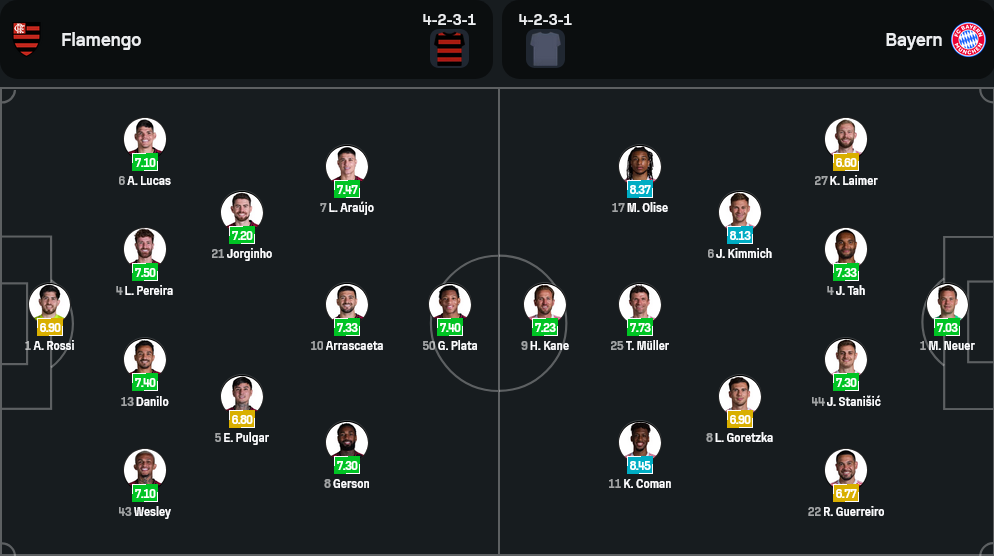 ฟลาเมงโก้ ภายใต้การนำของ ฟิลิเป้ ลุยส์ จัดเต็มผู้เล่นตัวหลักคืนสนาม หลังพักแกนหลักหลายคนในเกมเสมอลอส แองเจลิส นัดก่อน ความหวังหลักยังอยู่ที่ กอนซาโล่ ปลาต้า ที่ค้ำหน้าเป้า โดยมี เอแวร์ตอน อเราโฆ่, จอร์เจียน เด อาร์รัสกาเอต้า และ เกอร์สัน คอยสร้างสรรค์เกมรุก ส่วนแดนกลางใช้ประสบการณ์ของ จอร์จินโญ่ และ อีริค ปุลการ์ คุมจังหวะ เกมรับนำโดย เลโอ เปเรย์ร่า ซึ่งดูพร้อมรับมือศูนย์หน้าระดับแฮร์รี่ เคน