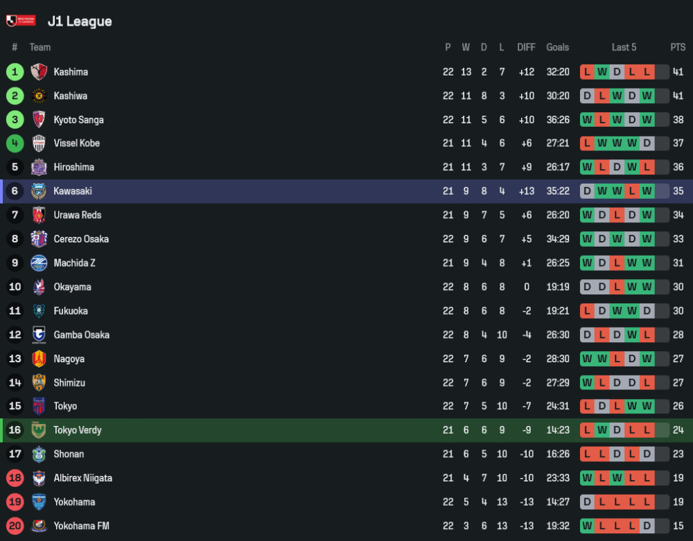 โตเกียว เวอร์ดี้ อยู่ในฟอร์มที่ไม่สู้ดีนัก แพ้ 4 จาก 5 เกมหลังสุดในทุกรายการ ยิงได้เพียงประตูเดียวใน 3 เกมลีกล่าสุด และเสียรวมถึง 11 ประตู ซึ่งบ่งบอกถึงจุดอ่อนทั้งเกมรุกที่ฝืด และแนวรับที่มีปัญหาการยืนตำแหน่ง เกมในบ้านก็ไม่แกร่งมากนัก เมื่อชนะเพียง 4 จาก 10 นัดที่เล่นต่อหน้าแฟนบอล