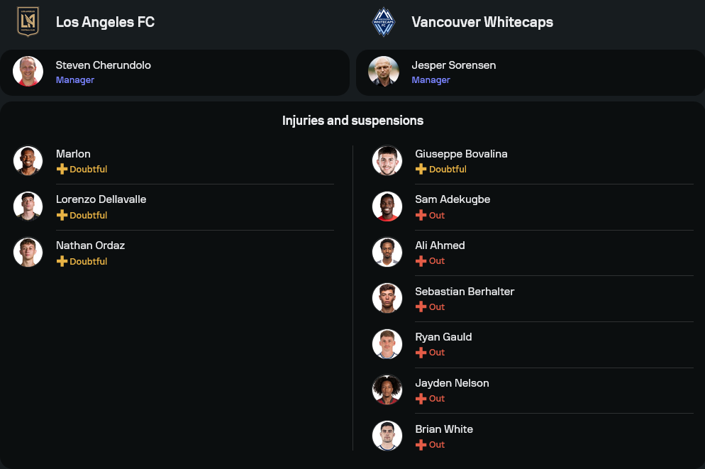 ด้าน แวนคูเวอร์ ไวต์แคปส์ ของกุนซือ เยสเปอร์ โซเรนเซ่น เจอปัญหาผู้เล่นเจ็บเล่นงานเพียบ ไม่ว่าจะเป็น ไรอัน กอลด์, ไบรอัน ไวท์, เจย์เดน เนลสัน, เซบาสเตียน เบอร์ฮอลเตอร์ และ แซม อเดคุกเบ้ โดยทั้งหมดหมดสิทธิ์ลงช่วยทีมแน่นอน ทำให้ตัวเลือกมีจำกัดและต้องยึดชุดเดิมจากเกมล่าสุด นำโดย เปโดร วีเต้ ดาวยิงฟอร์มแรง ยืนเป็นหน้าเป้าร่วมกับ ดาเนียล ริออส และ เอ็มมานูเอล ซับบี้ ส่วนแผงหลังใช้ แบลคมอน และ ลาบอร์ด้า ขนาบข้างด้วย เวเซลิโนวิช และ อุทวิค