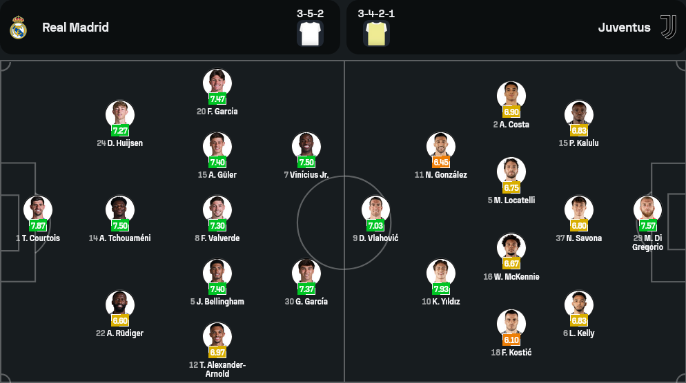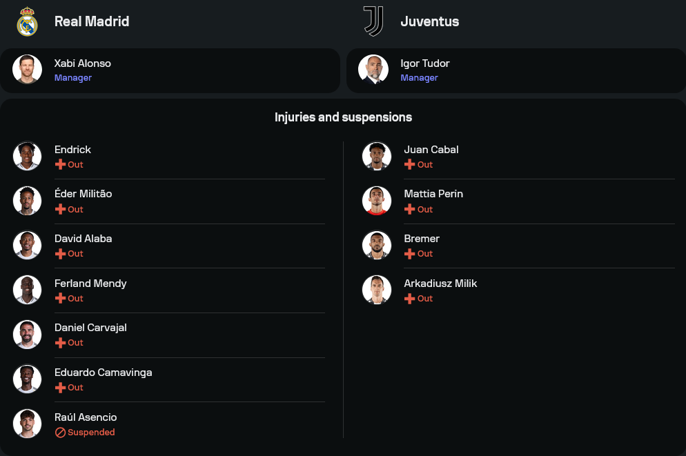 ฝั่ง เรอัล มาดริด ภายใต้การคุมทัพของ ชาบี อลอนโซ่ ยังคงเจอปัญหาเดิมคือขาดผู้เล่นแกนหลักหลายราย ไล่ตั้งแต่ เอ็นดริค, อลาบา, เมนดี้, การ์บาฆาล, คามาวิงก้า และ มิลิเตา ที่เดี้ยงยกแพ็ค ยังไม่รวม ราอูล อาเซนซิโอ ที่ติดโทษแบน ทำให้ภาระตกอยู่ที่แข้งฟอร์มเด่นอย่าง วินิซิอุส จูเนียร์, เบลลิ่งแฮม, ตูโชอาเมนี่ และนายด่านอย่าง ติโบต์ กูร์ตัวส์ โดยทีมยังคงยึดระบบ 3-5-2 เป็นหลัก