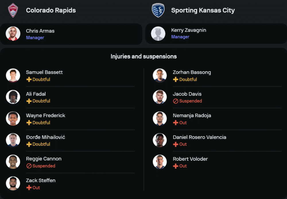 สปอร์ติ้ง แคนซัส ซิตี้ ของ เคอร์รี่ ซาวานญิน ต้องขาดตัวหลักหลายคนเช่นกัน โดยเนมันย่า ราโดย่า, ดาเนียล โรเซโร่ และโรเบิร์ต โวโลเดอร์ เจ็บทั้งหมด ขณะที่เจค็อบ เดวิส ติดโทษแบน แต่แกนหลักอย่าง เดยัน โยเวลยิช, ดาเนียล ซัลลอย และเอริค ธอมมี่ พร้อมลุยเต็มสูบในแผน 4-2-3-1 เช่นกัน โดยมี มานู การ์เซีย เป็นเพลย์เมกเกอร์ตัวคุมจังหวะ
