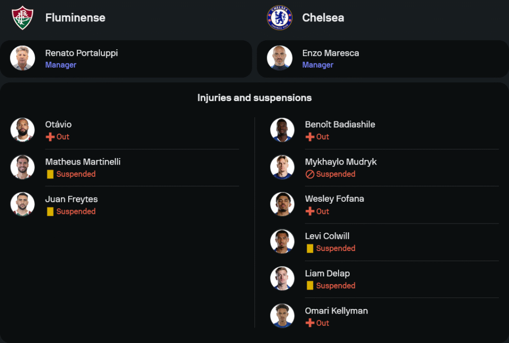 เอ็นโซ่ มาเรสก้า ก็มีปัญหาผู้เล่นเช่นกัน ทั้ง เบอนัวต์ บาเดียชิล, เวสลี่ย์ โฟฟาน่า, โอมาริ เคลลี่แมน เจ็บอยู่ก่อนแล้ว แถม มิคาอิโล มูดริค, ลีวาย โคลวิลล์ และ เลียม ดีแล็ป ยังติดโทษแบน เกมนี้ยังคงยึดแผน 4-2-3-1 วาง เจา เปโดร เป็นหอกเป้า มี เปโดร เนโต้, โคล พาลเมอร์ และ คริสโตเฟอร์ เอ็นกุนกู สนับสนุนอยู่ด้านหลัง ขณะที่คู่กลางยังเป็น เอ็นโซ่ เฟร์นานเดซ และ มอยเซส ไกเซโด้