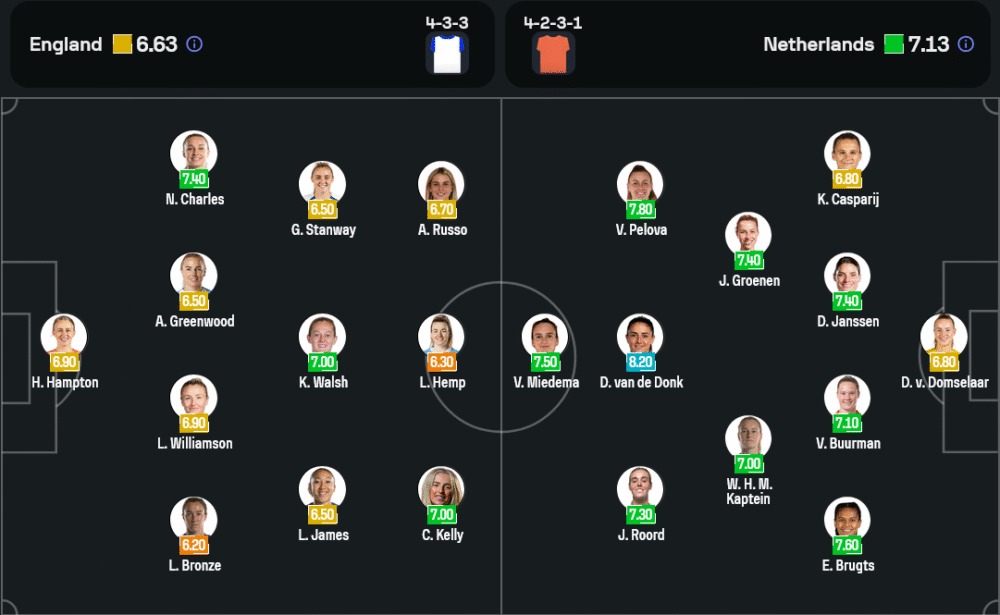 ลูกทีมของวีกมันน์ต้องรีบแก้มือหลังแพ้ฝรั่งเศส 1-2 ในนัดแรก เกมนั้นแม้คีร่า วอลช์จะยิงตีตื้นท้ายเกมแต่ก็สายไปแล้ว คาดว่าเธอจะปรับบางตำแหน่ง โดยส่ง นีแอมห์ ชาร์ลส์ ลงแทนเจส คาร์เตอร์ทางซ้าย ขณะที่แดนกลางมีโอกาสเห็น เกรซ คลินตัน ลงแทนรูเบ็น วอลช์ และแนวรุกอาจส่ง โคลอี้ เคลลี่ ลงมาเพิ่มมิติ ส่วน ลอเรน เจมส์, รุสโซ่ และมีด ยังคงเป็นสามประสานล่าตาข่าย