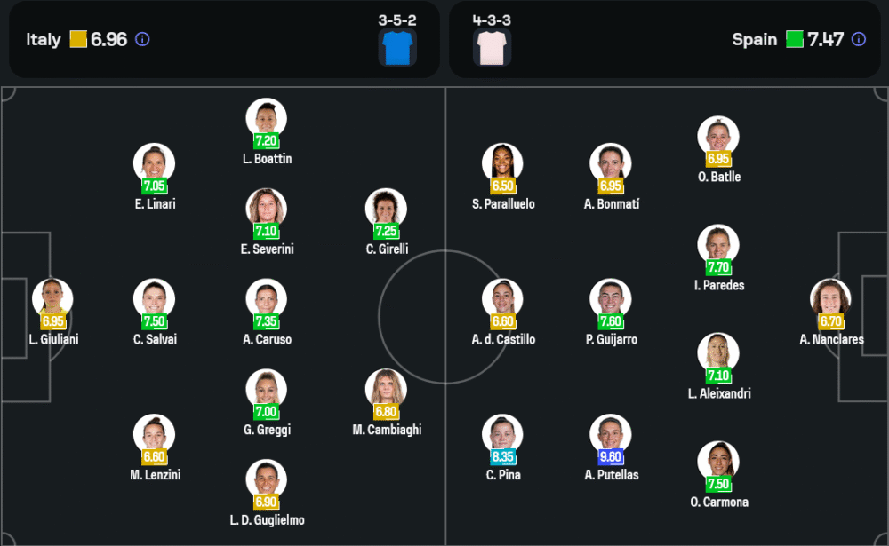 กุนซือ มอนต์เซ โตเม ไม่มีปัญหาให้กวนใจ เพราะทุกตำแหน่งพร้อมเต็มสูบ คาดว่าจะจัดเต็มด้วยระบบ 4-3-3 ผู้รักษาประตู มาเรีย โรดริเกซ แนวรับประกอบด้วย โอน่า บัตล์, อิเรเน ปาเรเดส, มาปิ ลีออน และโอลกา การ์โมน่า กลางสนามใช้ อเล็กเซีย ปูเตยาส, ไอทาน่า บอนมาติ และเทเรซ่า อาเบลเลร่า สามประสานแนวรุกเป็น มาร์ตา การ์โดน่า, เจนนิเฟอร์ เอร์โมโซ่ และมาริโอน่า คัลเดนเตย์