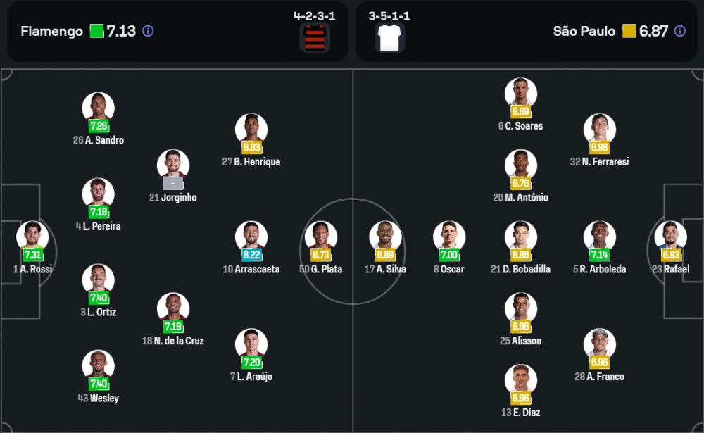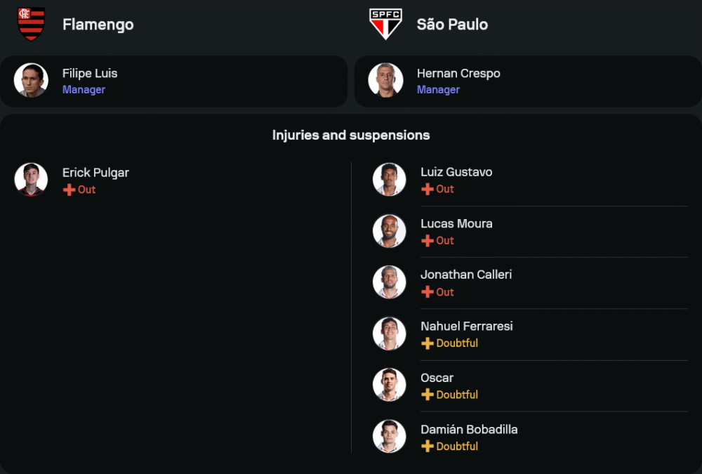 ลูกทีมของ เฮอร์นาน เครสโป เจอปัญหาหนักเพราะตัวหลักบาดเจ็บยกทีม ไล่ตั้งแต่ โจนาธาน กาเยรี่, ลูคัส มูร่า, ลุยซ์ กุสตาโว่, ออสการ์ และเซดริค โซอาเรส แต่ยังดีที่แกนหลักจากนัดแพ้วาสโกดากาม่ายังอยู่ครบ นัดนี้คาดว่าจะมาในระบบ 4-2-3-1 ใช้ อันเดร โอลิเวียร่า คุมเกมกลางรุกอยู่หลัง ลุกก้า มาร์เกส หัวหอกคนเดียวของทีม