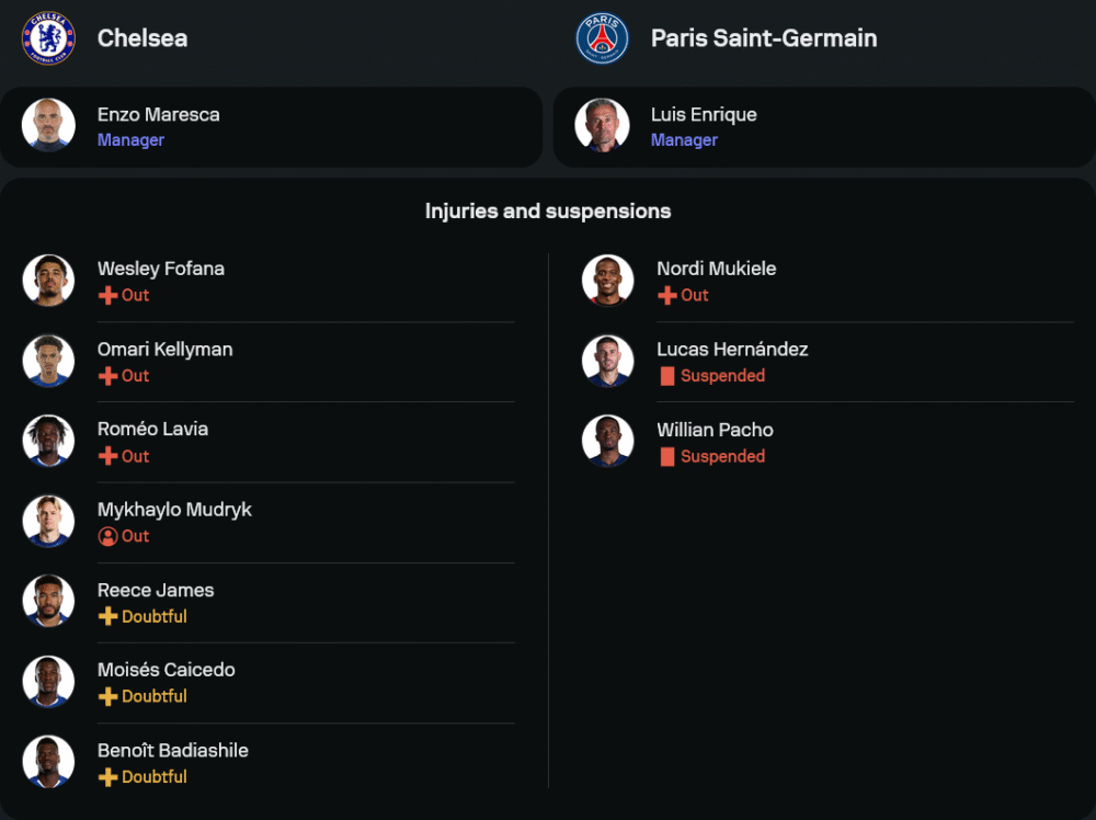 เชลซี ของกุนซือ เอนโซ่ มาเรสก้า เจอสภาพทีมที่ไม่สมบูรณ์แบบนักเมื่อไร้เงา เวสลี่ย์ โฟฟาน่า, โอมารี เคลลิมัน และโรเมโอ ลาเวีย ที่บาดเจ็บ ส่วน มิคายโล มูดริค ก็น่าจะไม่ผ่านฟิต ด้าน รีซ เจมส์, เบอนัวต์ บาเดียชิล และ มอยเซส ไกเซโด้ ส่อเค้าว่าจะได้มีชื่อสำรองมากกว่า ผู้เล่นหลักยังเป็นหน้าที่ของ โรเบิร์ต ซานเชซ, โตซิน อดาราบิโอโย่, โคล พัลเมอร์, คริสโตเฟอร์ เอ็นกุนกู และดาวเด่นฟอร์มแรงอย่าง เจา เปโดร กับ เปโดร เนโต้